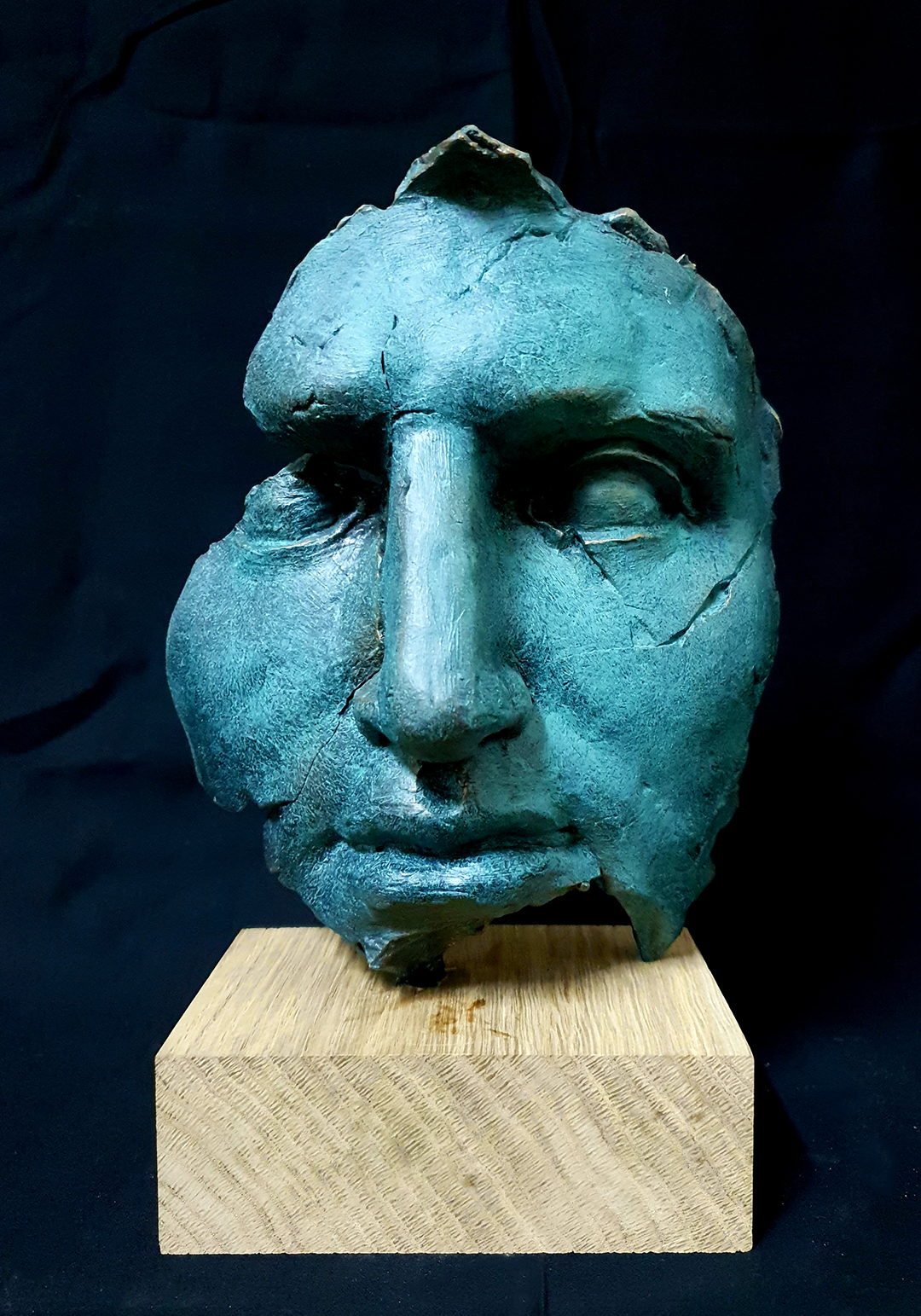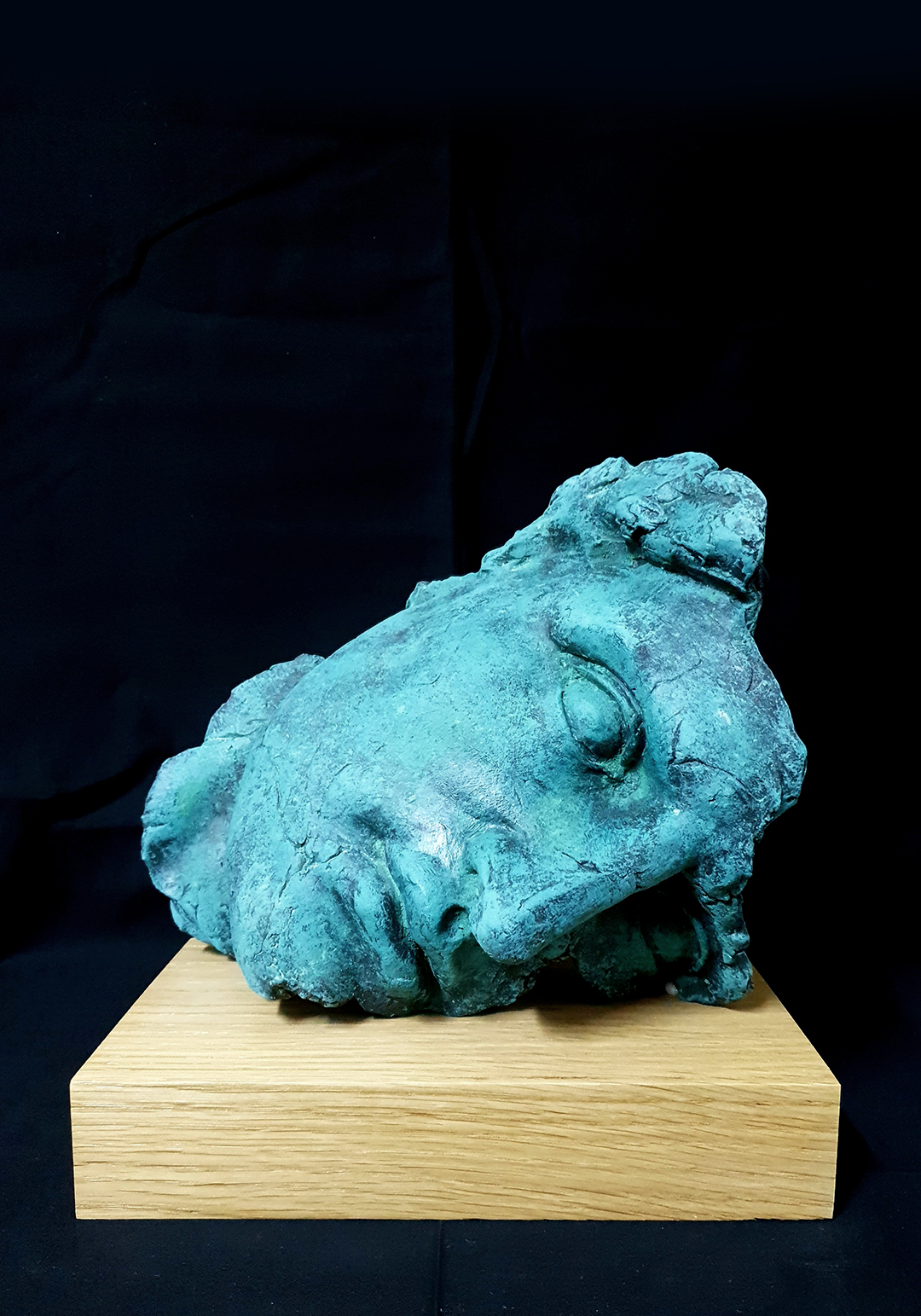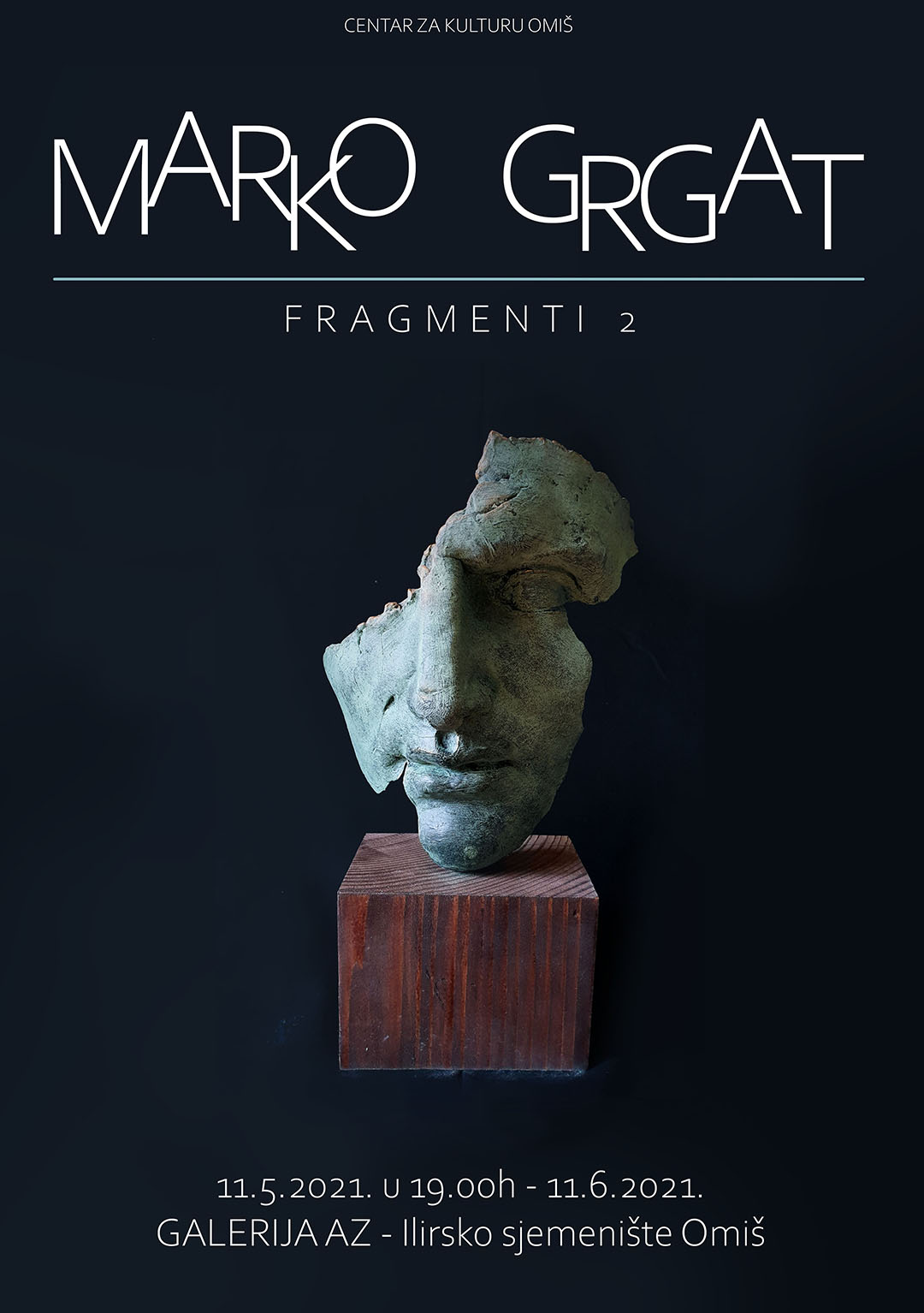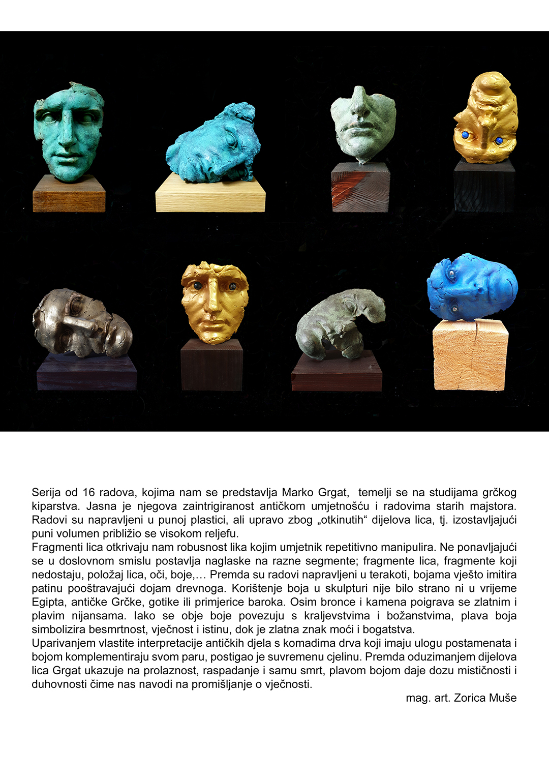 Serija od 16 radova, kojima nam se predstavlja Marko Grgat,  temelji se na studijama grčkog kiparstva. Jasna je njegova zaintrigiranost antičkom umjetnošću i radovima starih majstora. Radovi su napravljeni u punoj plastici, ali se upravo zbog „otkinutih“ dijelova lica, tj. izostavljajući puni volumen, približio visokom reljefu. Fragmenti lica otkrivaju nam robusnost lika kojim umjetnik repetativno manipulira. Ne ponavljajući se, u doslovnom smislu postavlja naglaske na razne segmente; fragmente lica, fragmente koji nedostaju, položaj lica, oči, boje… Premda su radovi napravljeni u terakoti, bojama vješto imitira patinu pooštravajući dojam drevnoga. Korištenje boja u skulpturi nije bilo strano ni u vrijeme Egipta, antičke Grčke, gotike ili primjerice baroka. Osim bronce i kamena poigrava se zlatnim i plavim nijansama. Iako se obje boje povezuju s kraljevstvima i božanstvima, plava boja simbolizira besmrtnost, vječnost i istinu, dok je zlatna znak moći i bogatstva. Uparivanjem vlastite interpretacije antičkih djela s komadima drva koji imaju ulogu postamenata i bojom komplementiraju svom paru, postigao je suvremenu cjelinu. Premda oduzimanjem dijelova lica Grgat ukazuje na prolaznost, raspadanje i samu smrt, plavom bojom daje dozu mističnosti i duhovnosti čime nas navodi na promišljanje o vječnosti. Više>>